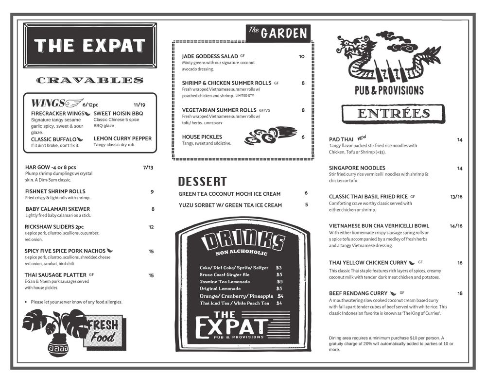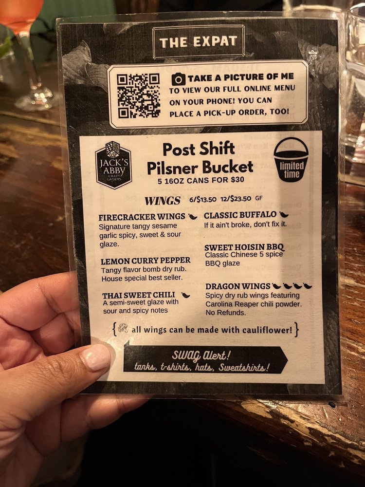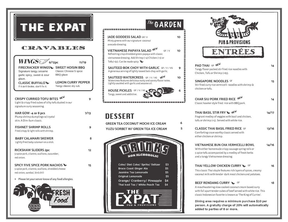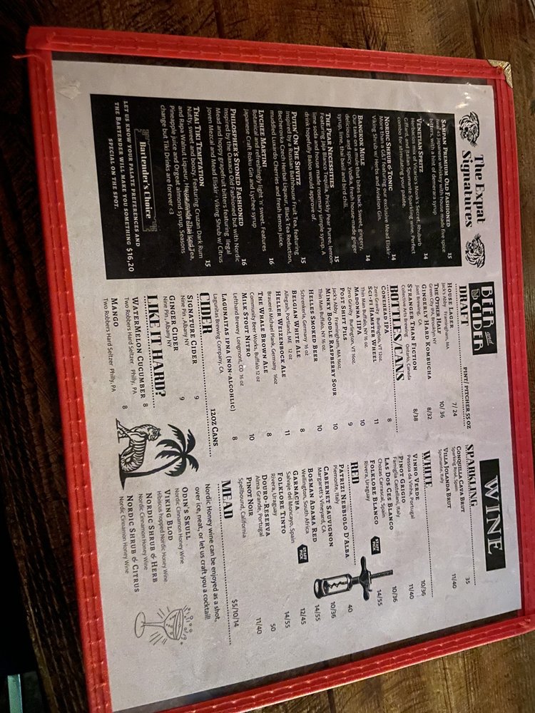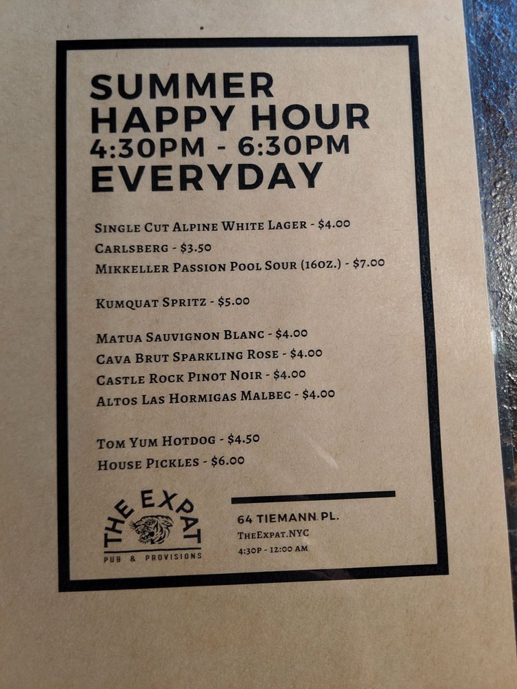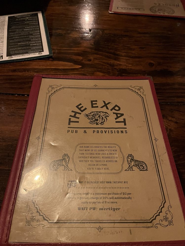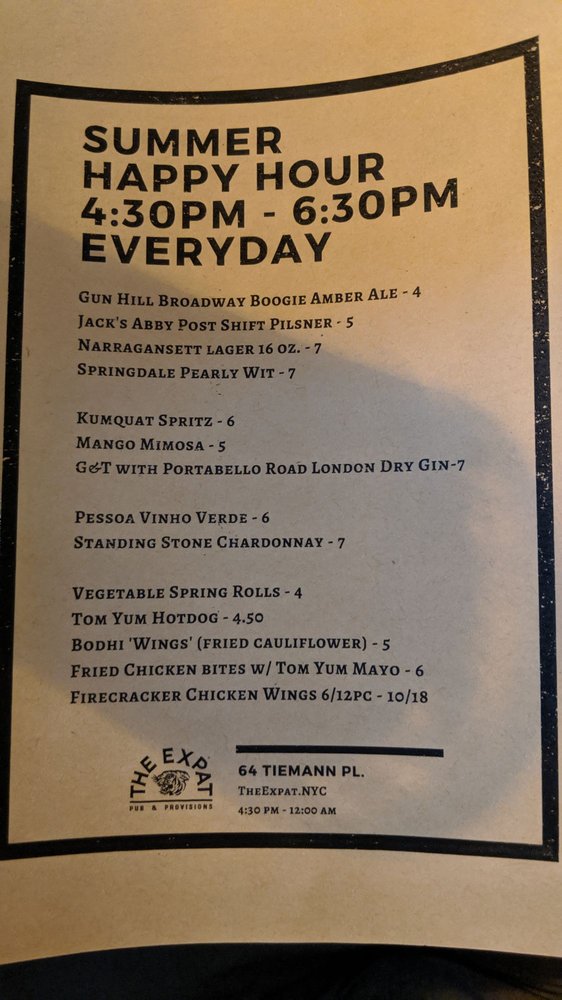 "The Expat" at 64 Tiemann Pl in New York is a gastropub offering a diverse range of options including Pescatarian, Vegan, and Vegetarian choices. The welcoming atmosphere features hipster, casual, trendy, and intimate vibes, perfect for a night out with friends. From the tasty Thai Mule cocktail to the flavorful dishes like Bahnmi B.E.C. and Roti with curry chicken, every bite at The Expat is a delight. The innovative menu also includes unique options like Steak and Eggs and wings, all prepared with fresh ingredients. Customers praise the friendly service and commendable dishes, making it a must-visit spot in the city. Whether you're looking for a relaxing dinner or a late-night hangout, The Expat offers a diverse range of dishes and drinks to satisfy every palate.
